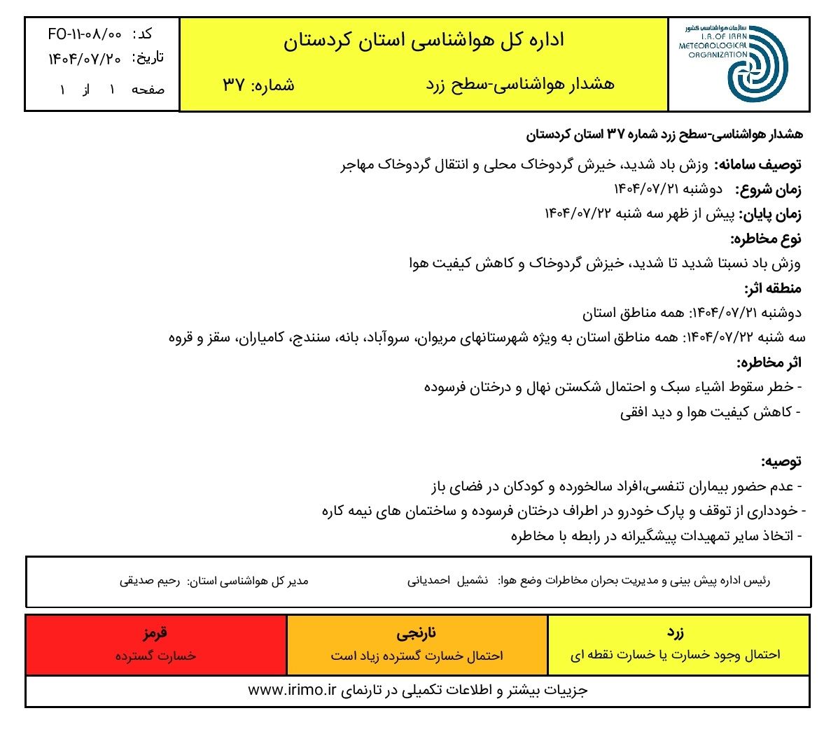 هواشناسی کردستان با صدور هشدار سطح زرد از وزش باد شدید، خیزش غبار محلی و انتقال گرد و خاک مهاجر خبر داد.