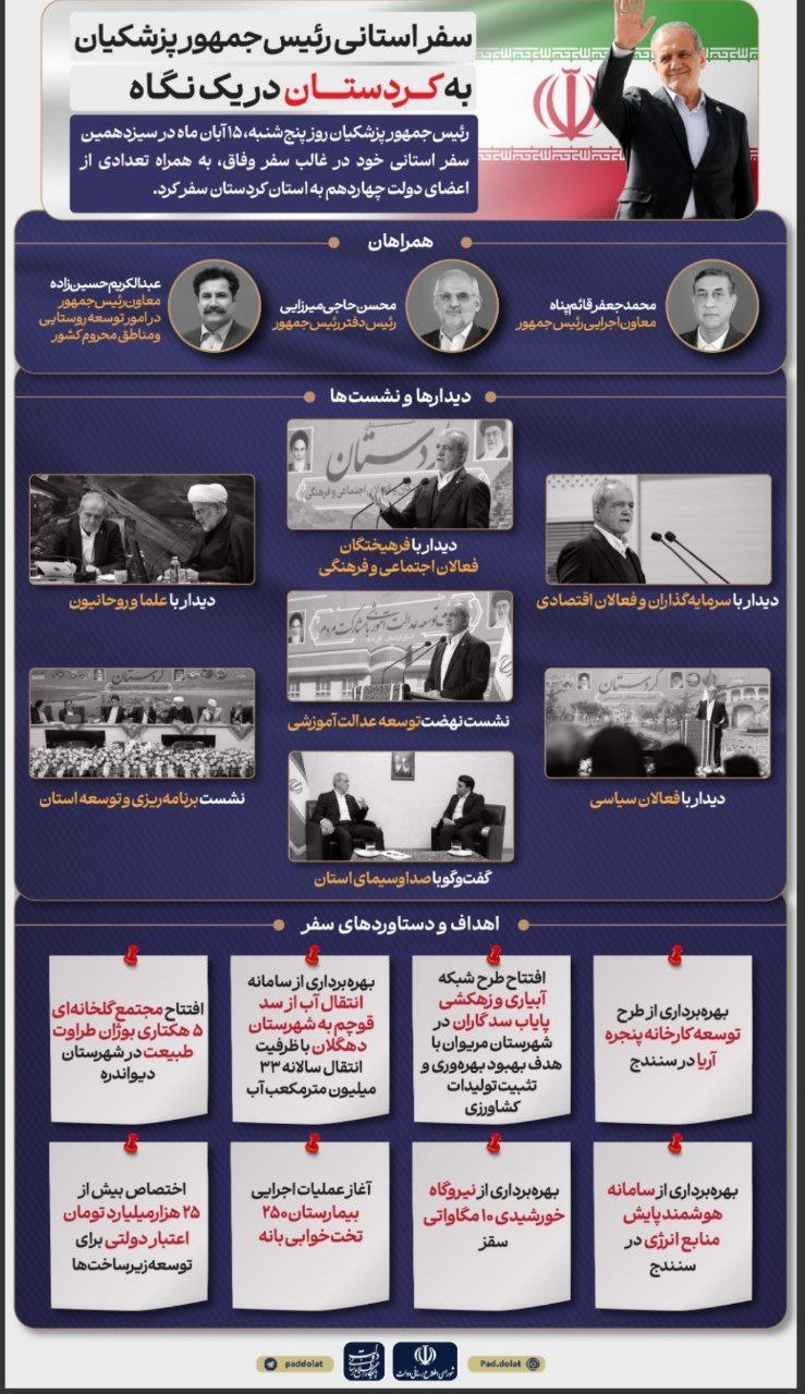 سفر یک‌روزه رئیس‌جمهور به استان کردستان با اعلام نهایی شدن ۳۲ پروژه و اعتباری بالغ بر ۲۵ هزار و ۳۹۷ میلیارد تومان به پایان رسید. مسئولان استانی این سفر را گامی مهم برای توسعه کردستان عنوان کردند و نهادهای اطلاع‌رسانی نیز جزئیاتی از دستاوردهای سفر را در قالب یک پوستر منتشر کردند.