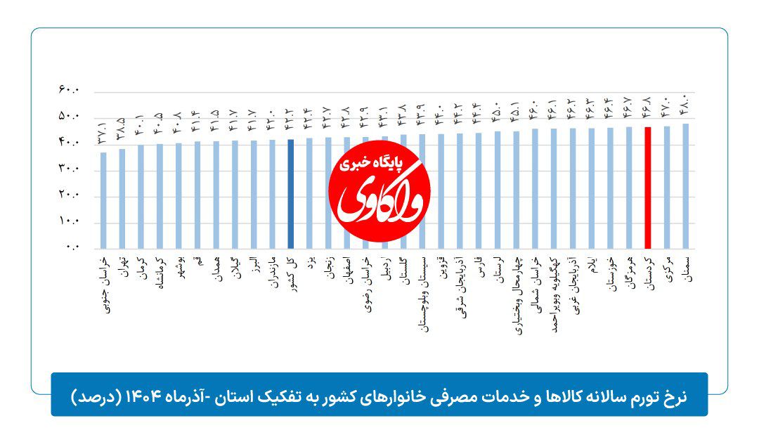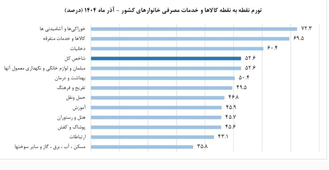 در آذر ماه ۱۴۰۴ شاخص قیمت مصرف کننده خانوارهای کشور به عدد ۴۳۵٫۱ رسیده است که نسبت به ماه قبل، ۴٫۲ درصد افزایش، نسبت به ماه مشابه سال قبل، ۵۲٫۶ درصد افزایش و در دوازده ماهه منتهی به ماه جاری نسبت به دوره مشابه سال قبل، ۴۲٫۲ درصد افزایش داشته است.