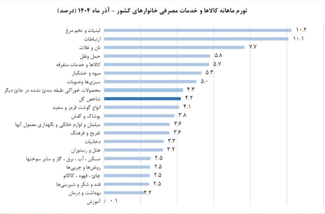 در آذر ماه ۱۴۰۴ نرخ تورم سالانه برای خانوارهای کشور به ۴۲٫۲ درصد رسیده که نسبت به همین اطلاع در ماه قبل، ۱٫۸ واحد درصد افزایش یافته است.